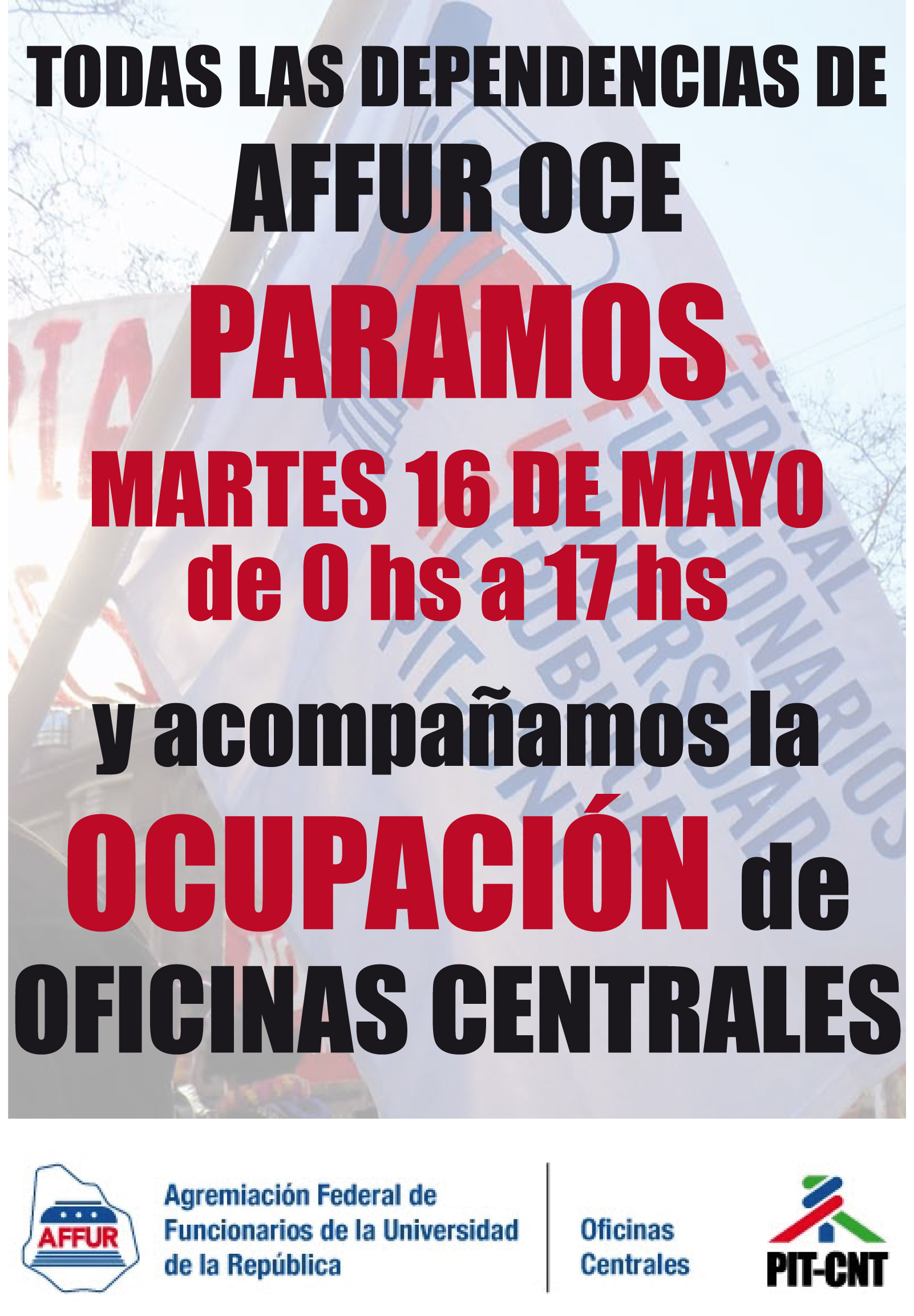 De las cero hora a las 17 horas del martes 16 de mayo affur oce para y ocupa con toda la Federación el Local de Oficinas centrales.