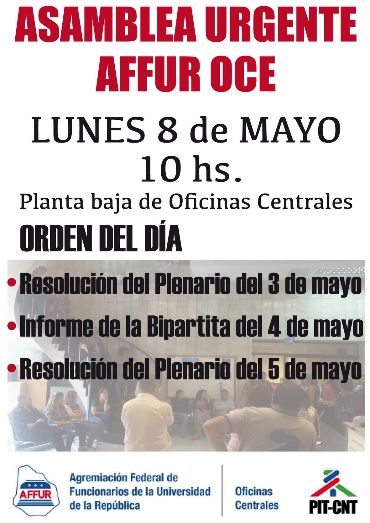ASAMBLEA URGENTE 8 DE MAYO Paul Schiera May 4, 2017, Oficinas Centrales 1.26kViews Share on Facebook Tweet on Twitter ASAMBLEA 8 mayo _ ORDEN DEL DÍA Resolución del plenario del día 3 de Mayo. Informe de la Bipartita del día 4 de Mayo Resolución del plenario del día 5 de Mayo. Tags Category Oficinas Centrales Date May 4, 2017