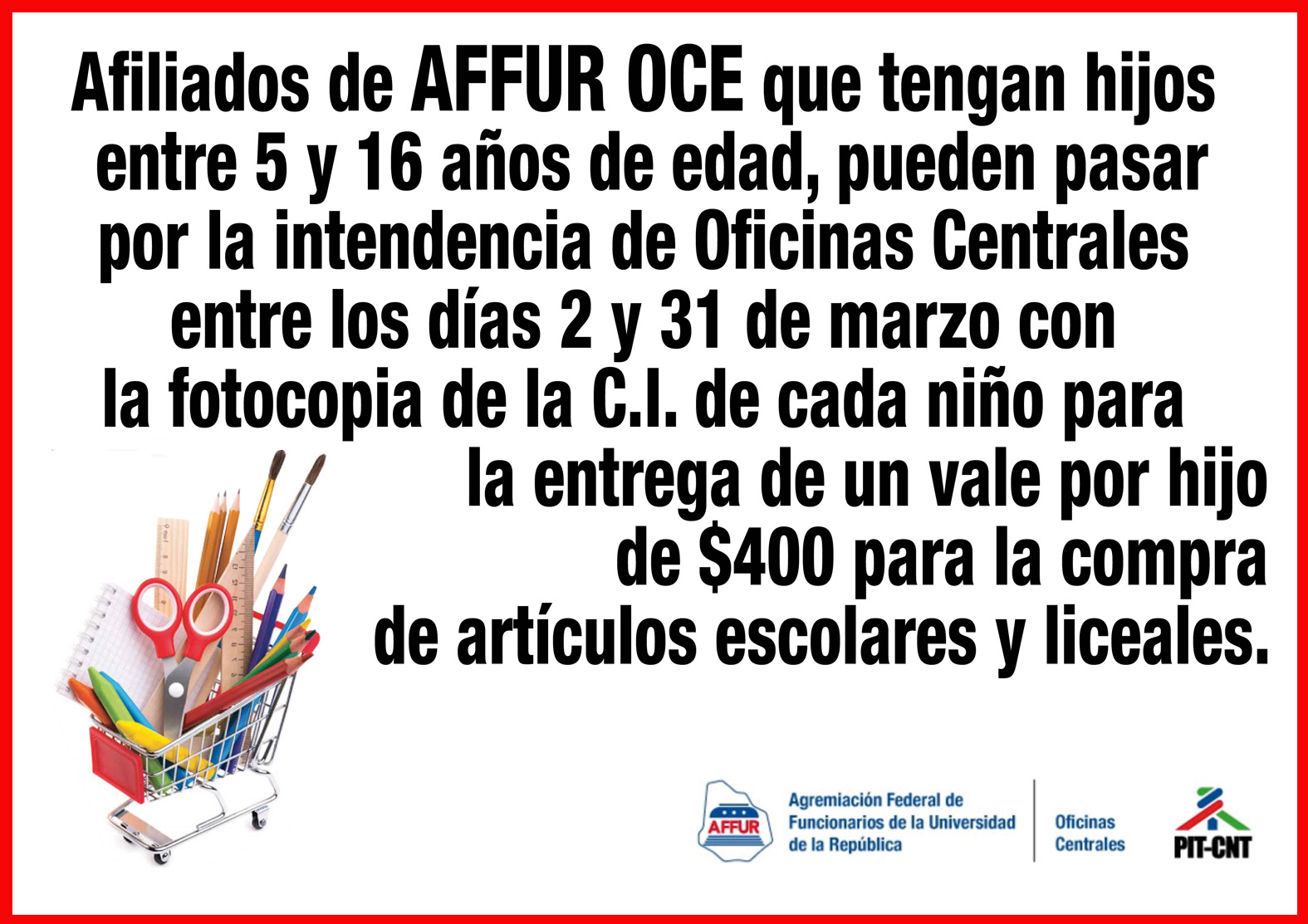 A partir del 2 de marzo y hasta el día 31 inclusive los afilados a AFFUR OCE que tengan hijos  entre 5 y 16 años de edad podrán pasar a retirar por Intendencia de Oficinas Centrales un vale por hijo para útiles escolares valor $400 pesos .  Requisito presentar  la fotocopia de la C.I de cada hijo y del titular.