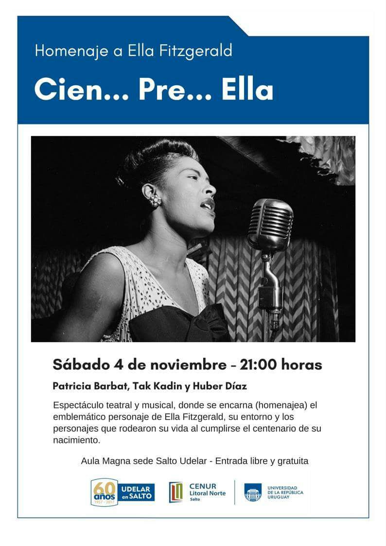 Después de haber pasado con gran exito por el Centro Universitario de Rivera llega al Aula Magna de la UDELAR sede Salto el sábado 4 de Noviembre a las 21 horas el espectáculo teatral y musical donde se homenajea a la Ella Fitzgerald «La Reina del Jazz» , su entorno… y los personajes que rodearon su vida al cumplirse el centenario de su nacimiento. Cada tema musical que se interpreta es apoyado por la teatralidad de una escena que refuerza y acentúa situaciones que van hilvanado la vida desde su infancia hasta la madurez de esta excepcional mujer que supo luchar contra la discriminación por ser afrodescendiente y mujer en una sociedad machista y xenofóbica.