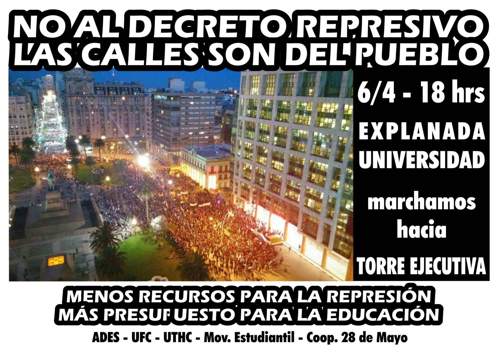 Este jueves 6 de abril a las 18 hrs marchamos contra el decreto represivo que emitiera el Poder Ejecutivo en los últimos días de marzo habilitando al ministerio del interior a intervenir en ocasión de cortes de calles limitando de esta manera el ejercicio de la Libertad de Expresión consagrado en la Constitución de la República.