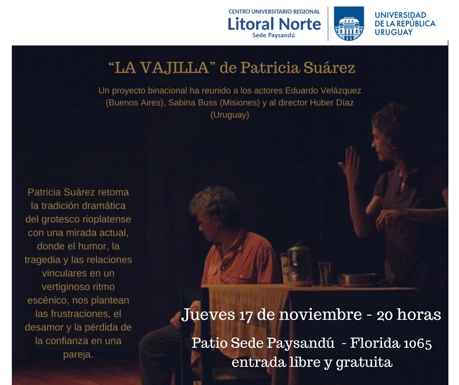 En Salto y Paysandú _ Taller para interesados en la cinematografía y la obra teatral «La Vajilla» dirigida por el uruguayo Huber Díaz( Compañero de Oficinas Centrales ) y un elenco Argentino integrado por los actores Eduardo Velazques y Sabina Buss.- Sabina Buss también es Directora de Cultura de la Municipalidad de Puerto Esperanza-Misiones e Iñaki Echevarría director de Cine. Todos ellos son docentes y tienen múltiples actividades relacionadas con el teatro y el cine. Todas las actividades son con entrada libre.