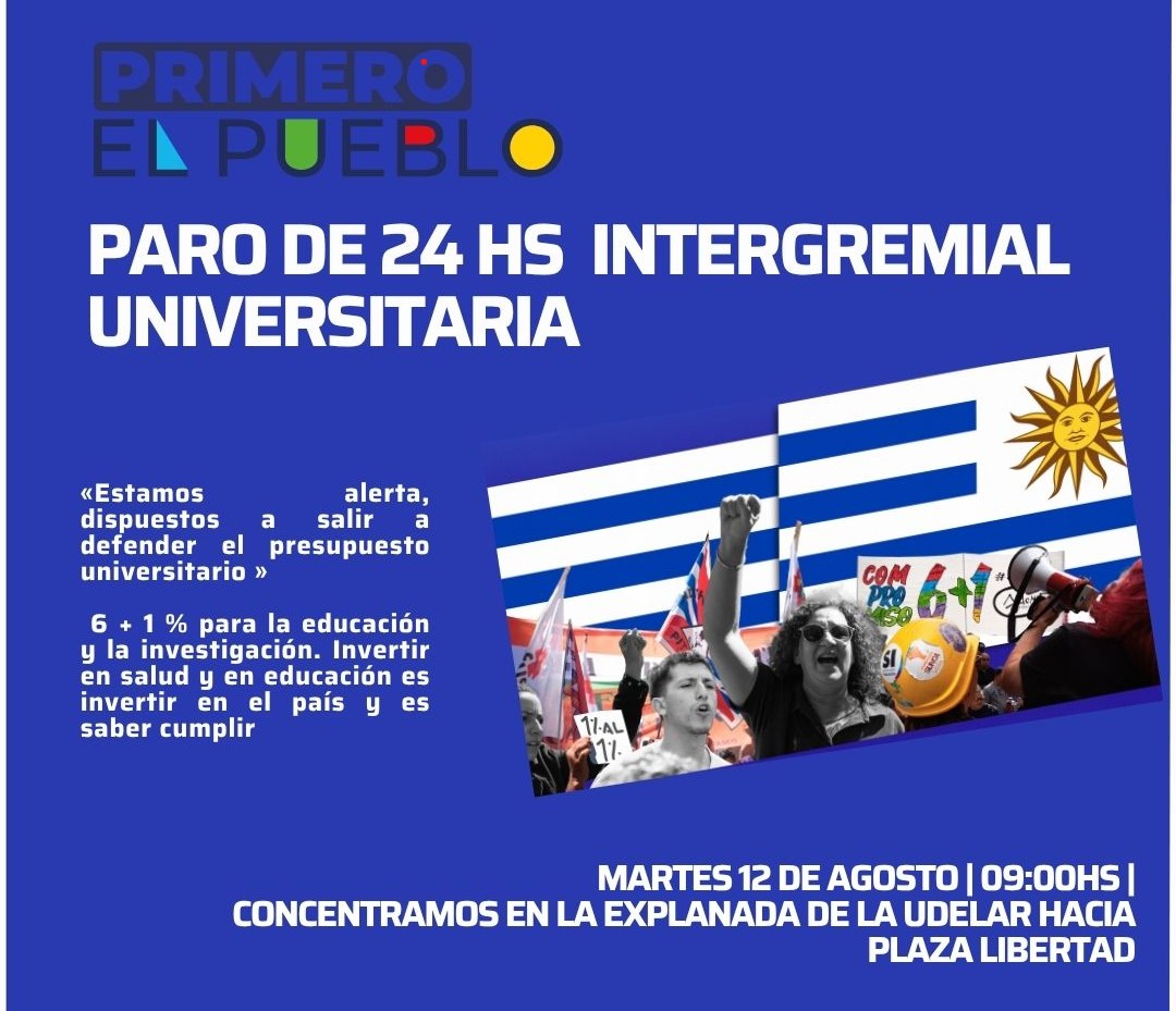 3) Adherir al paro general del 12 de agosto, con paro de 24 horas junto a la Intergremial Universitaria y la CSEU, convocando a todos los sindicatos de base a movilizarse, concentrando a las 9:00 horas en la explanada de la Udelar.