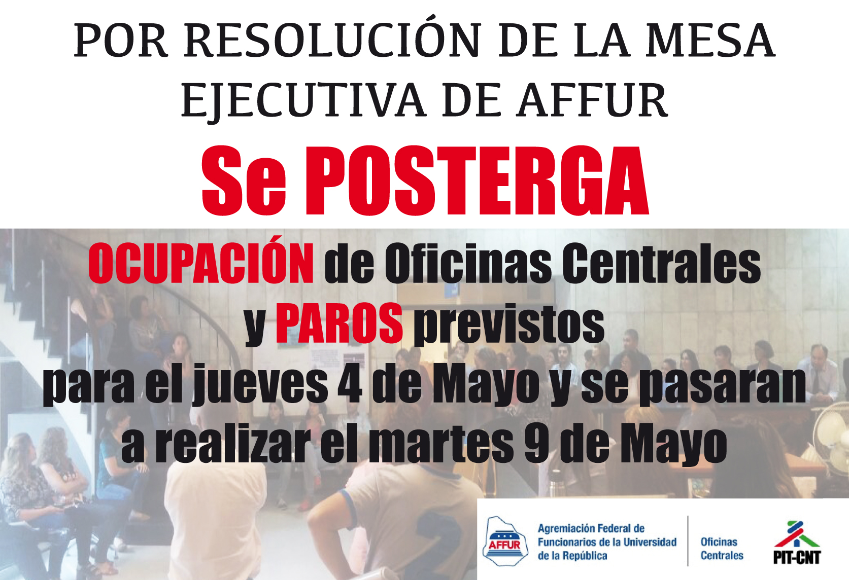 Para no entorpecer el diálogo con la institución y poder concretar en acuerdos escritos los acuerdos verbales alcanzados con el Rector, se POSTERGA la ocupación de OFICINAS CENTRALES y PAROS previstos para el día 4 de Mayo , la cual se realizará el día martes 9 de mayo .